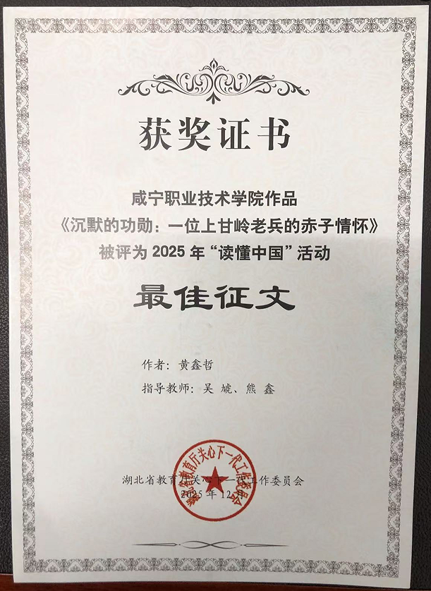 近日,湖北省教育厅关心下一代工作委员会公布2025年“读懂中国”活动评选结果,我校荣获优秀组织奖,征文《沉默的功勋:一位上甘岭老兵的赤子情怀》获评最佳征文奖,展现学校立德树人与红色文化育人成果。