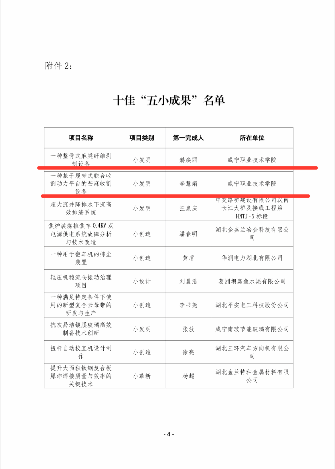 在此次表彰的“十佳‘五小成果’”中,赫焕丽老师的“一种整骨式麻类纤维剥制设备”、李慧娟老师的“一种基于履带式联合收割动力平台的苎麻收割设备”均入选,两项成果均属于“小发明”类别,聚焦麻类产业装备创新,为地方特色产业技术升级提供了实用方案;程寿绵老师则凭借扎实的学习能力与岗位履职表现,入选“优秀学习型职工”名单。