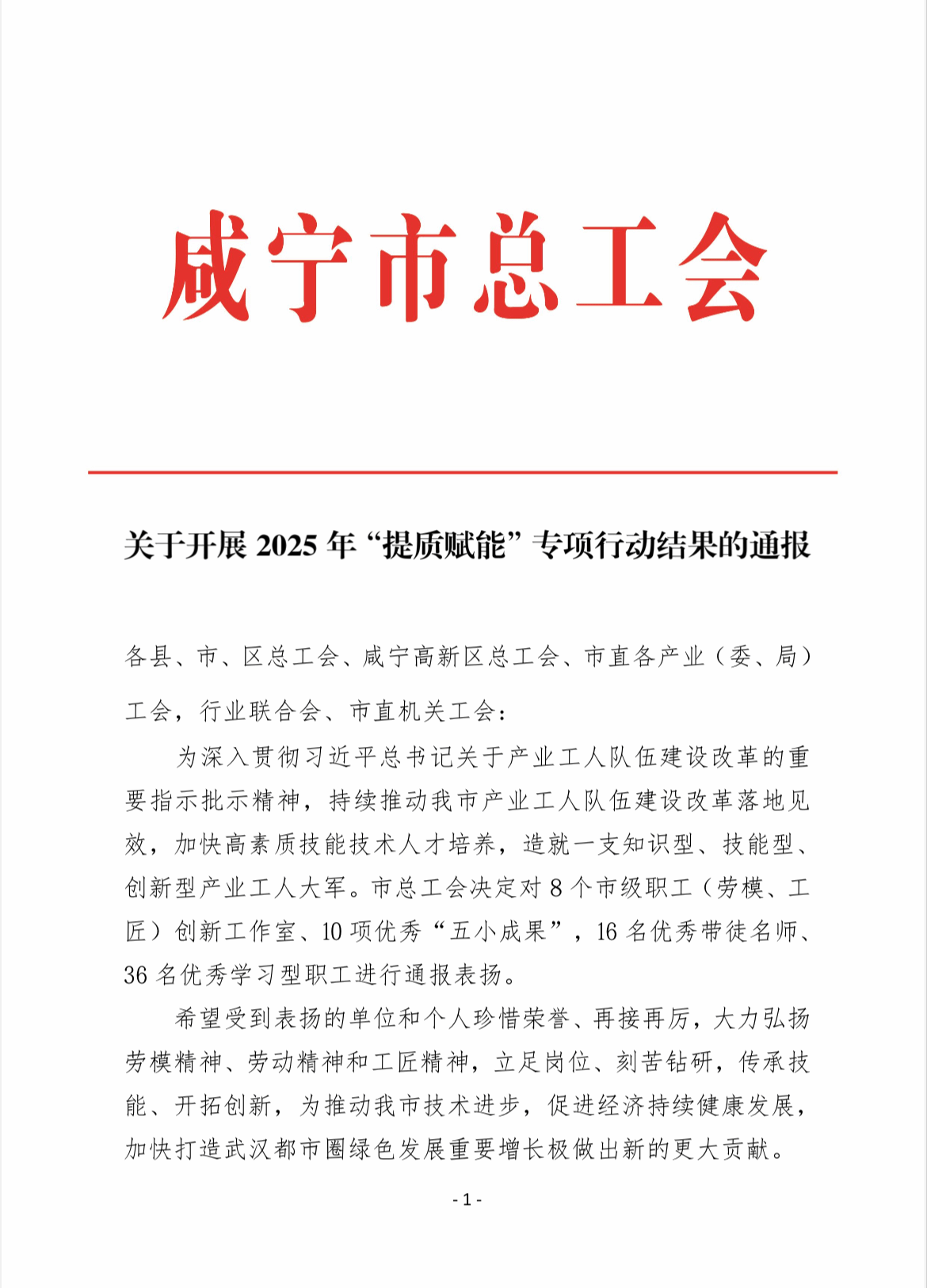 近日,咸宁市总工会发布2025年“提质赋能”专项行动结果通报,咸宁职业技术学院赫焕丽、李慧娟、程寿绵三位教师凭借突出成果,分别在“十佳‘五小成果’”“优秀学习型职工”评选中斩获荣誉,获市级通报表彰。